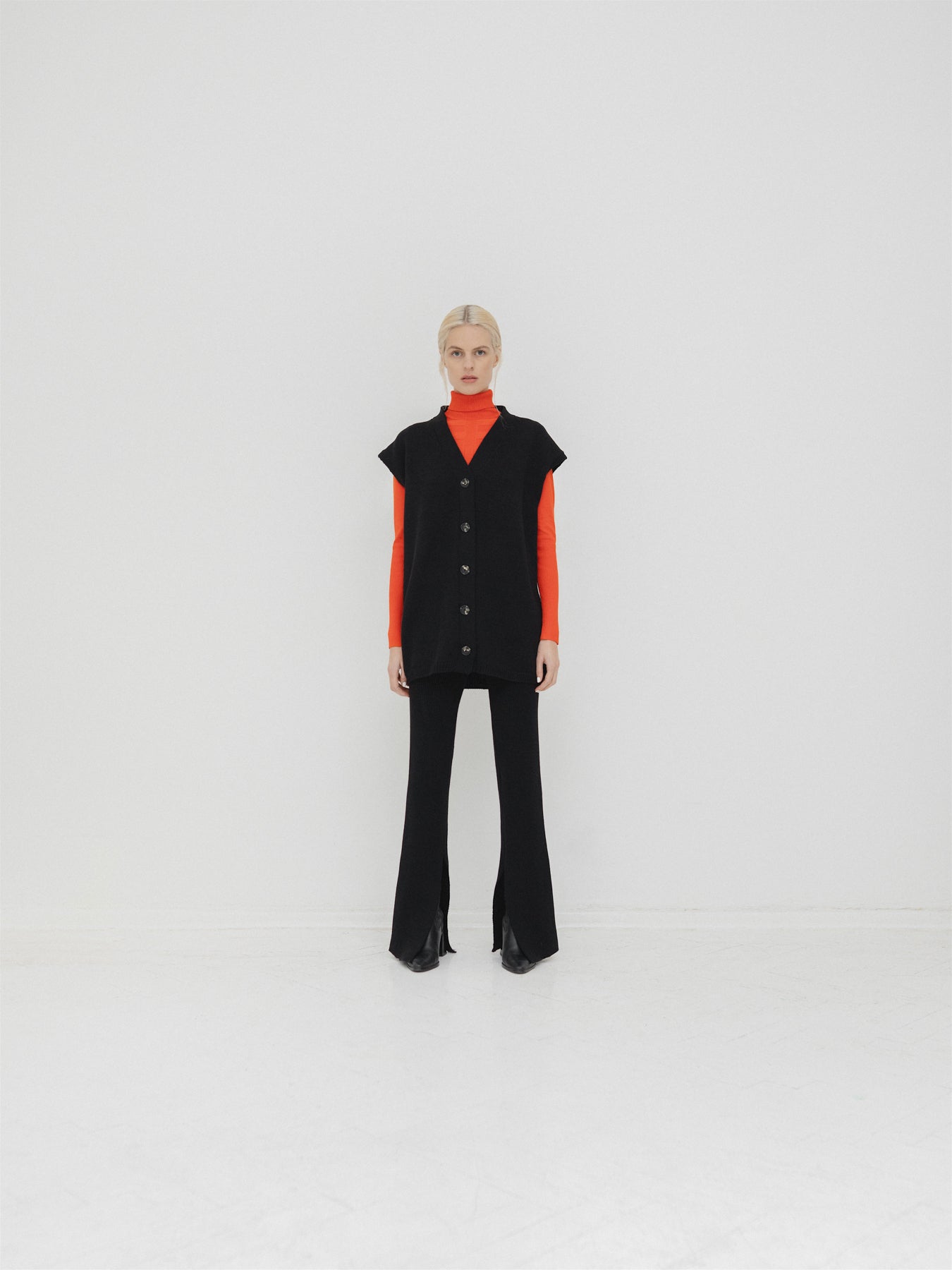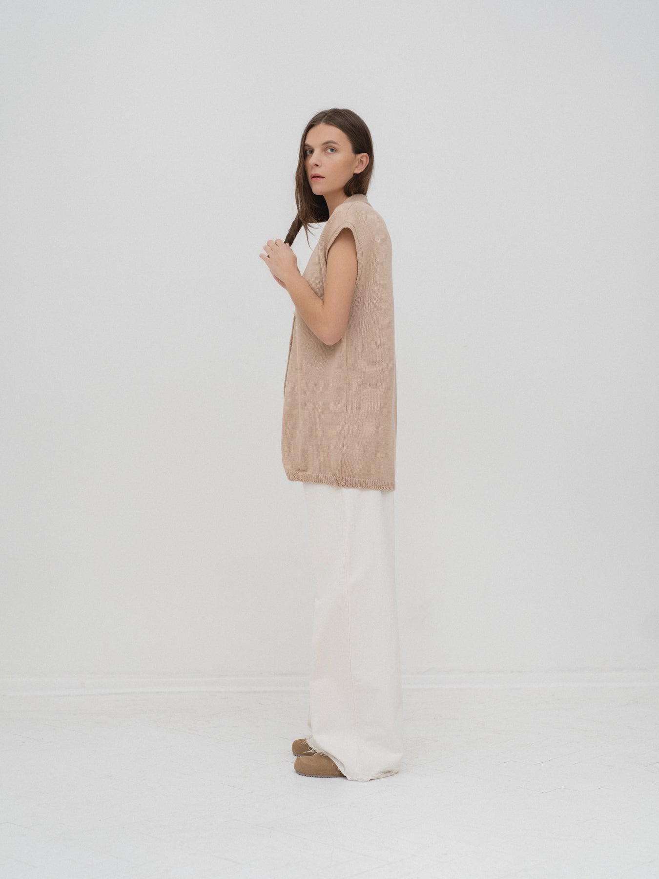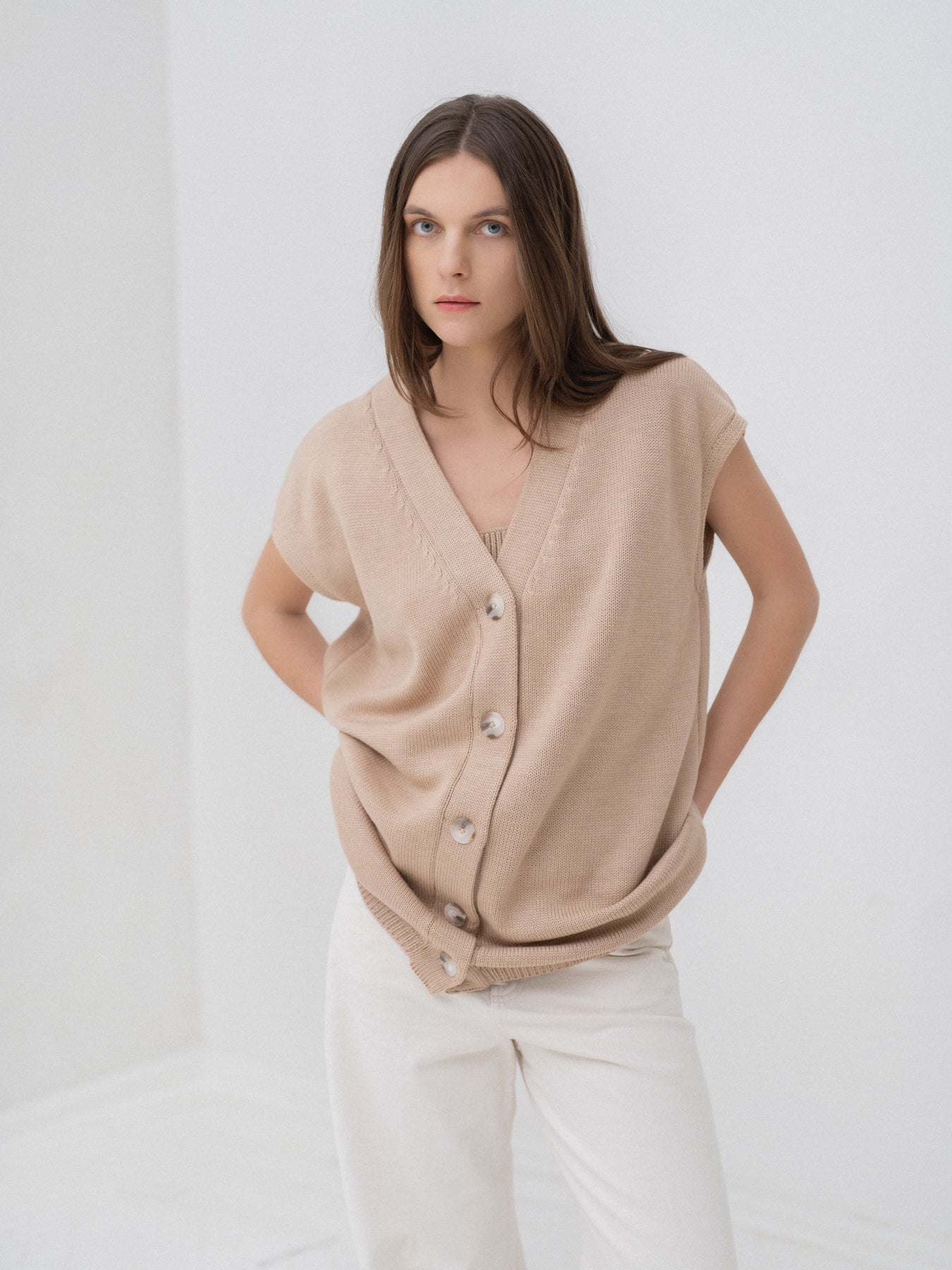 Paired with Ines knitted leggings, this vest is like a modernized cardigan. A vest with buttons, dropped shoulders, oversize silhouette - helps to create many combinations - from your favorite shirts to blouses with a high neck, and if the room is warm - you can safely wear one.