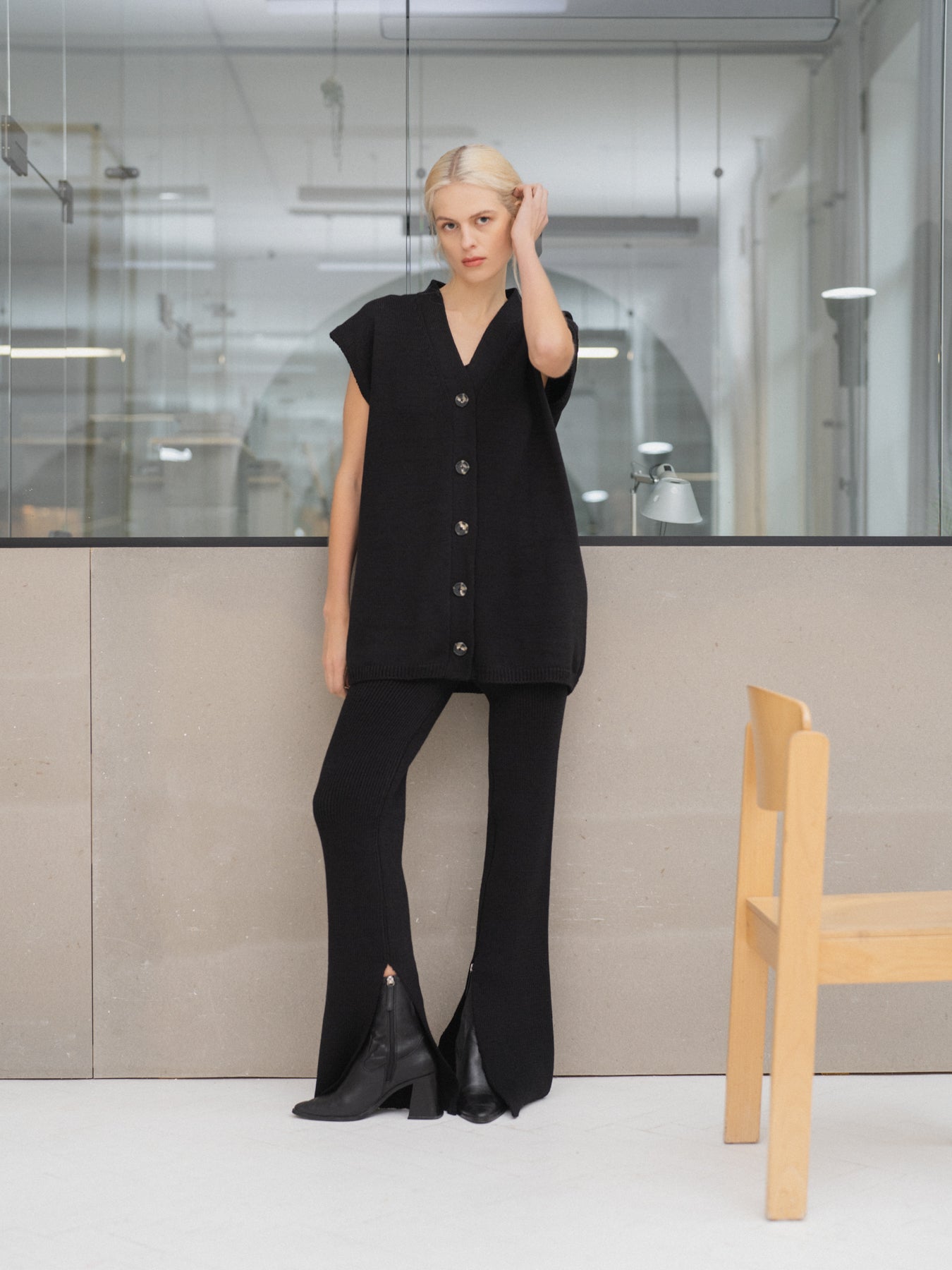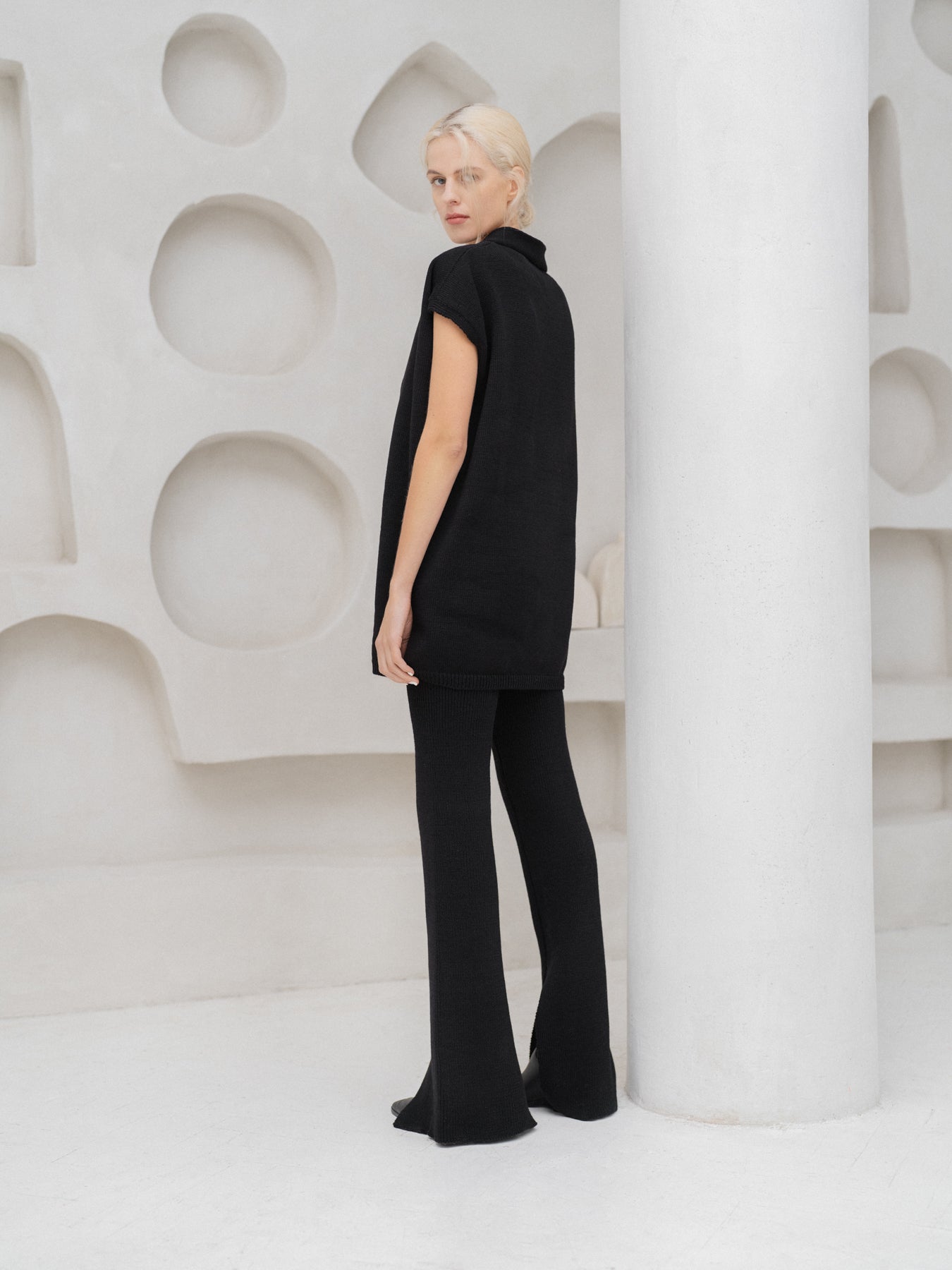 A vest is a versatile choice that can be combined with a wide variety of clothes. However, to create a special combination, we recommend choosing pants with a narrower silhouette. The contrast between the oversize vest and skinny pants creates a perfect, modern combination. If you don't have skinny pants, try a combination with our leggings Ines, this way you will not only getting a discount on buying a whole suit, but you will also have the opportunity to create many interesting and stylish combinations. Knitted Elastic Ines - justeknit.com